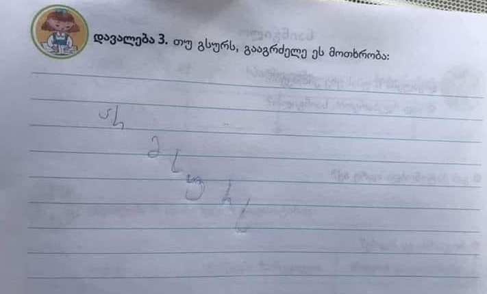 სოციალურ ქსელში გავრცელდა ფოტო, რომელზეც სკოლის მოსწავლეს მოთხრობის გაგრძელებას სურვილის მიხედვით სთხოვენ.