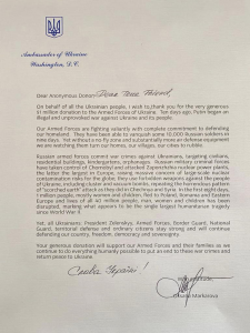 უკრაინის ელჩი აშშ-ში ოქსანა მარკაროვა ანონიმური პირისგან მიღებული დონაციის შესახებ ჰყვება. უკრაინის ხელისუფლებამ არ იცის ამ ადამიანის პერსონალური მონაცემები, მაგრამ ცნობილია, რომ თანხა ფიზიკურმა პირმა აშშ-დან გადარიცხა.