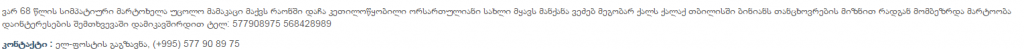 „ვარ 68 წლის სიმპატიური, მარტოხელა, უცოლო მამაკაცი. მაქვს რაონში „დაჩა”, კეთილმოწყობილი ორსართულიანი სახლი, მყავს მანქანა, ვეძებ მეგობარ ქალს ქალაქ თბილისში ბინიანს თანაცხოვრების მიზნით, რადგან მომბეზრდა მარტოობა. დაინტერესების შემთხვევაში დამიკავშირდით“, – ამ განცხადების ავტორი ჯიმშერ ნადირაძეა, რომელიც საჩხერის რაიონში ცხოვრობს და პენსიონერია.