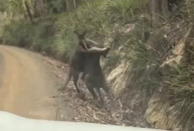 ტასმანელმა ქალმა კამერით ის მომენტი აღბეჭდა, როდესაც ორი კენგურუ გზის პირას ერთმანეთს დაუპირისპირდა.