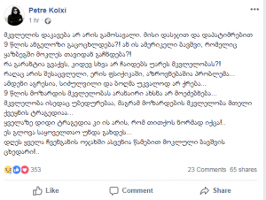 გორში 8 წლის გოგონას მკვლელობას მამა პეტრე “ფეისბუქის” პირად გვერდზე ეხმაურება.