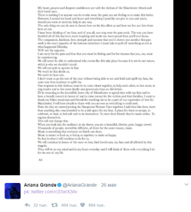 “მე მზად ვარ, ყველაფერი გავაკეთო, რაც შემიძლია. ჩვენ ვერასდროს გავიგებთ, რატომ ხდება ასეთი მოვლენები, იმიტომ, რომ ეს ჩვენი ბუნებისთვის დამახასიათებელი არ არის. ჩვენ არ ვიმოქმედებთ შიშით. ჩვენ არ მივცემთ მას უფლებას, რომ დაგვაშოროს. ჩვენ არ დავუშვებთ, რომ სიძულვილმა გაიმარჯვოს. ძალადობაზე პასუხი უნდა გვაახლოებდეს, ერთმანეთს უნდა ვეხმარებოდეთ, გვიყვარდეს მეტად, ვიმეგობროთ უფრო გულუხვად და მეგობრულად, ვიდრე ამას აქამდე ვაკეთებდით. მუსიკა არის ის, რაც დედამიწაზე ყველას შეგვიძლია ერთმანეთს გავუზიაროთ. მუსიკა გულისხმობს განკურნებას, ის გვაერთიანებს, იმისთვის, რომ ბედნიერები ვიყოთ. ჩვენ გავაგრძელებთ ჩვენს საქმეს. ჩვენ დავკარგეთ საყვარელი ადამიანები – ჩემი გულშემატკივარი და ამ ტრაგედიით ყველა დაზარალებული ჩემს გონებასა და გულში ყოველდღე იქნება. მთელი დარჩენილი ცხოვრება, მათთვის ყველაფერი უნდა გავაკეთო”, – წერს არიანა.