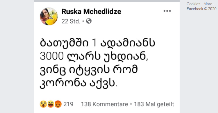 “ბათუმში ერთ ადამიანს 3 ათას ლარს უხდიან, ვინც იტყვის, რომ კორონა აქვს” – სოციალური ქსელის მომხმარებლის აღნიშნულ სტატუსს და “ფეიკნიუსს” დიდი გამოხმაურება და ძალიან სასაცილო კომენტარები მოჰყვა.