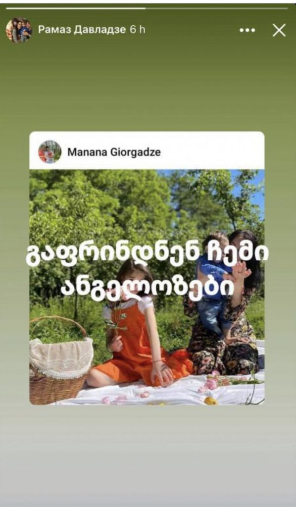 რამაზ დავლაძემ, რომელსაც წარმოუდგენლად დიდი ტრაგედია დაატყდა თავს და ოჯახის 4 წევრი კორპუსის ჩამონგრევის შედეგად დაეღუპა, სოციალური ქსელის “სთორიში” გარდაცვლილი მეუღლისა და შვილების ფოტო გააზიარა. სურათს წარწერაც ახლავს – “გაფრინდნენ ჩემი ანგელოზები”.