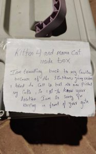 „ოთხი კნუტი და დედა-კატა ყუთში არიან. აქ არსებული ვითარების გამო სამშობლოში ვბრუნდები. ვცდილობდი დაგიკავშირდეთ, მაგრამ ვერავინ მიპასუხა და მხოლოდ თქვენი მისამართი ვიპოვე. ძალიან ვწუხვარ, რომ მათ თქვენს კართან ვტოვებ.“