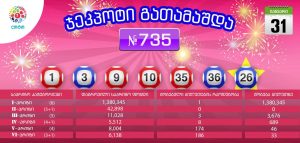 31 იანვარს, „ლოტო 6/36″ – ის 735-ე გათამაშებაზე მორიგი ჯეკპოტი 1,380,345 ლარი გათამაშდა. რიგით მე-17 ჯეკპოტის მომგებიანი რიცხვების კომბინაცია შემდეგნაირად გადანაწილდა: 1,3,9,10,35,36 იღბლიანი ბილეთის მფლობელი მოგების გასანაღდებლად თბილისში, მელიქიშვილის N16 მდებარე ლატარიის კომპანიის ბეთინგ ცენტრს უნდა ეწვიოს.