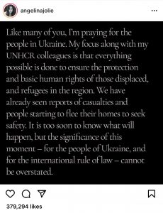 ჰოლივუდის მსახიობმა და გაეროს კეთილი ნების ელჩმა ანჯელინა ჯოლიმ უკრაინელებს მხარდაჭერის სიტყვებით მიმართა და რუსეთის ფედერაცია დამოუკიდებელ ქვეყანაზე ღია თავდასხმის გამო გააკრიტიკა. მან აღნიშნა, რომ ლოცულობს უკრაინისთვის და ყველაფერს აკეთებს რეგიონში დევნილთა და ლტოლვილთა ადამიანის უფლებების დაცვის უზრუნველსაყოფად.