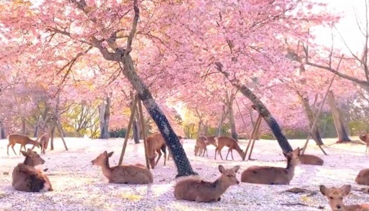 ზღაპარი დედამიწაზე – იაპონიის ერთ–ერთ დაცარიელებულ პარკში, სადაც საკურა ყვავის, ირმები გამოჩნდნენ (ფოტო)