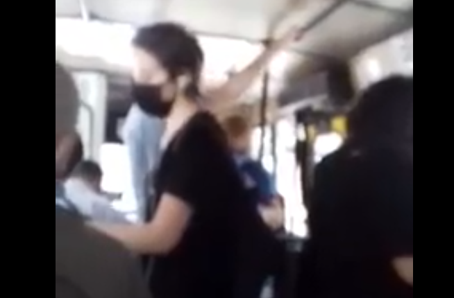 მგზავრი პირბადის გარეშე და დაპირისპირება ავტობუსში – ქალი ამბობს, რომ კორონავირუსი ბილ გეითსის გეგმაა ხალხის დასახოცად (ვიდეო)