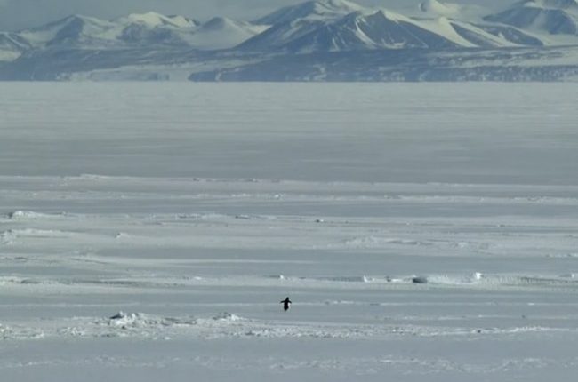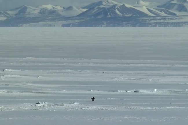 ერთ-ერთ ეპიზოდში კამერა უჩვეულო სურათს აფიქსირებს: მაშინ, როცა პინგვინების კოლონა ოკეანისკენ — საკვების წყაროსკენ — მოძრაობს, ერთი მათგანი მოულოდნელად მიმართულებას იცვლის და ხმელეთის სიღრმისკენ იწყებს სვლას. მის წინ მხოლოდ ყინული, თოვლი და შორეული მთებია, რომლებიც სანაპიროდან დაახლოებით 70 კილომეტრით არის დაშორებული.