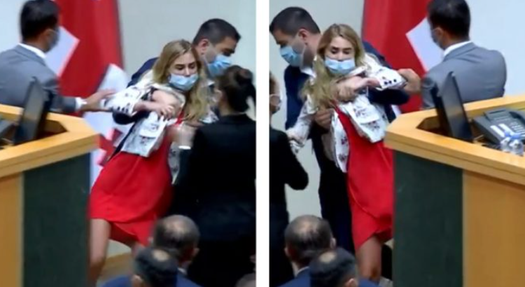 “ქართული ოცნების” დეპუტატმა, შალვა პაპუაშვილმა “ენმ” -ს წევრი, თინა ბოკუჩავა პარლამენტის თავჯდომარესთან არ მიუშვა, ხელში აიყვანა და ძალის გამოყენებით ტრიბუნას გაარიდა.
