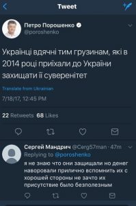 „უკრაინელები ძალიან მადლობლები არიან ქართველების, რომლებიც უკრაინაში 2014 წელს ჩამოვიდნენ, რათა უკრაინის სუვერენიტეტი დაეცვათ“, – წერს პოროშენკო „ტვიტერზე“.