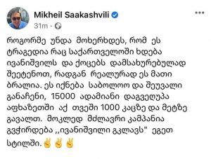 „როგორმე უნდა მოხერხდეს, რომ ეს ტრაგედია, რაც საქართველოში ხდება, ივანიშვილს და ქოცებს დამსახურებულად შეეტენოთ, რადგან რეალურად ეს მათი ბრალია. ეს იქნება საბოლოო და შეუვალი განაჩენი, 15 000 ადამიანი დაგვეღუპა აფხაზეთში, აქ თვეში 1000 კაცზე და მეტზე გავალთ. მოკლედ, მძლავრი კამპანია გვჭირდება ,,ივანიშვილი გკლავს“ ეგეთ სტილში“, – წერს სააკაშვილი.