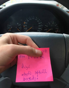 „გუშინ ჩემს ფეისბუქს ვსქროლავდი და ასეთ ამბავს წავაწყდი, მაკა გიორგის მანქანას დაეჯახა და ეს წერილი დაუტოვა. რომ მოვიკითხე, დაზღვევა არცერთს არ ჰქონია.
