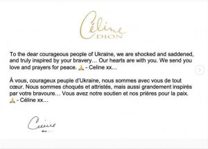 “ძვირფასო უშიშარო უკრაინელებო. შოკირებული და დასევდიანებული ვართ, ასევე შთაგონებულნი – თქვენი სიმამაცით. ჩვენი გულები თქვენთან არის. გიგზავნით სიყვარულს და ლოცვას მშვიდობისთვის”, – წერს სელინ დიონი.