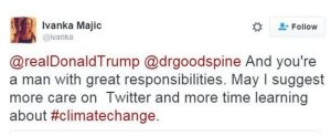 აშშ-ის არჩეულმა პრეზიდენტმა, დონალდ ტრამპმა ტვიტერში საკუთრი შვილის, ივანკა ტრამპის ნაცვლად, სხვა გოგონა მონიშნა. ამის შესახებ „ბი ბი სი“ იუწყება. როგორც „ბი ბი სის“ ივანკა მაიჩმა განუცხადა, მისი მეუღლე დილის 6 საათზე ჟურნალისტებმა გააღვიძეს და უთხრეს, რომ მისი ექაუნთი ტრამპმა მონიშნა.