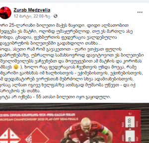 ერთ-ერთი ასეთი ზურაბ მეძველიაა, მისი თქმით საქართველო ბელარუსის მატჩი, რომელიც 26 მარტს არის დაგეგმილი კორონავირუსის გამო არ ჩატარდება, ხოლო ბილეთები უკვე გაყიდულია.