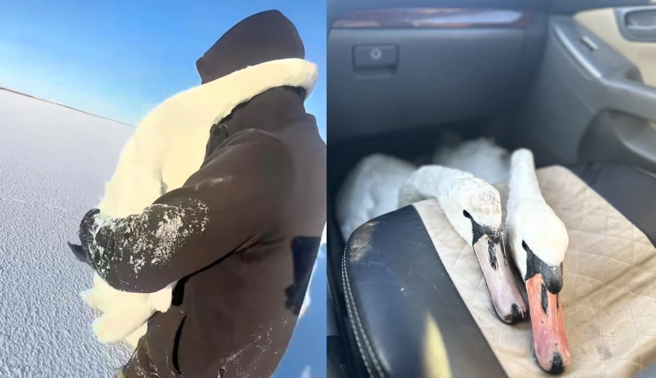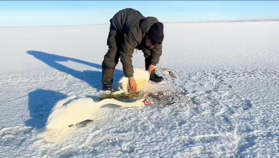 უკან დაბრუნებისას მათ მოშორებით კიდევ ერთი თეთრი ლაქა შენიშნეს. მეორე გედს, როგორც ჩანს, ბუმბული ყინულზე ჰქონდა მიყინული და გადაადგილებას ვერ ახერხებდა. ბაურჟანმა ხელებით დაიწყო ყინულის გათბობა, რათა ფრინველი ფრთხილად გაეთავისუფლებინა და ზიანი არ მიეყენებინა.