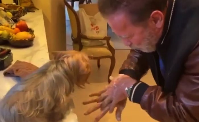 არნოლდ შვარცნეგერმა საკუთარ ძაღლს აჩვენა, თუ როგორ უნდა დაიბანოს სწორად ხელები, რათა კორონავირუსი არ შეეყაროს. მსახიობის თქმით, ის ხელებს დღეში 50-ჯერ იბანს და განსაკუთრებულ ყურადღებას უთმობს ფრჩხილებს.