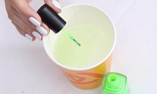 2. წყლიან ჭიქაში სათითაოდ ჩააწვეთეთ სხვადასხვა ფერის ლაქი.