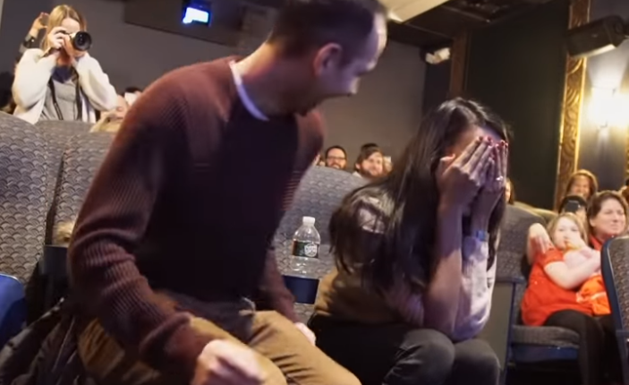 კინოში მულტფილმის სანახავად მისული წყვილი, ჩაბნელებულ დარბაზში ახლობლებისა და მეგობრების გარემოცვაში იყვნენ. ლის რჩეულმა კი ეს არ იცოდა და მისთვის ყოველივე ძალიან მოულოდნელი აღმოჩნდა.