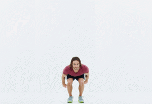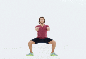 ფეხები მხრების სიგანეზე, მუხლები – ოდნავ მოხრილი, მკლავები კი მკერდის წინ უნდა გქონდეთ. ახტით და ეცადეთ, რომ ხელები არ ჩამოუშვათ. გაიმეორეთ 12-ჯერ.
