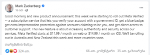 “ამ კვირაში ჩვენ ვიწყებთ Meta Verified – გამოწერის სერვისს, რომელიც საშუალებას მოგცემთ გადაამოწმოთ თქვენი ანგარიში პირადობის მოწმობით, მიიღოთ ლურჯი ემბლემა, მიიღოთ დამატებითი დაცვა ანგარიშებისგან და მიიღოთ პირდაპირი წვდომა კლიენტების მხარდაჭერაზე. ეს ახალი ფუნქცია ეხება ავთენტურობისა და უსაფრთხოების გაზრდას ჩვენს სერვისებში. Meta Verified-ის ღირებულება ვებზე ყოველთვიურად 11.99 დოლარიდან დაიწყება, iOS-ზე კი 14.99 დოლარიდან” – წერს ცუკენბერგი.